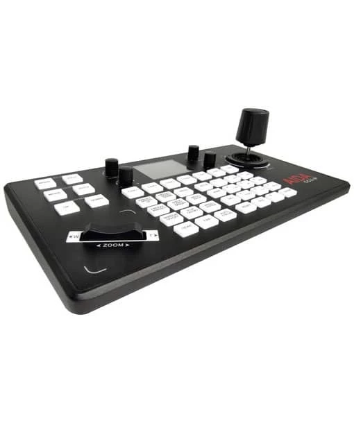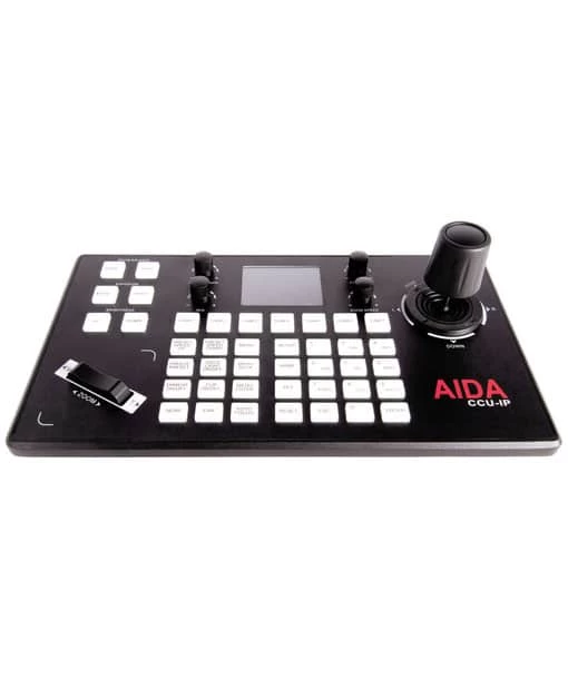 The AIDA Imaging CCU-IP VISCA Serial & IP PTZ Camera Controller offers joystick and button control for up to seven PTZ cameras with support for VISCA and VISCA-over-IP protocols over IP and serial RS-232 and RS-422 communication. It enables you to control the speed of your pan, tilt, zoom, and lock moves and incorporates an LCD screen.