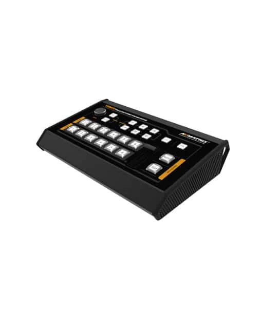 Its interface features source and destination buttons and a T-bar for transitions and cuts as well as mix, fade, and wipe effects. It features a tally interface and emergency fade-to-black (FTB) functionality.