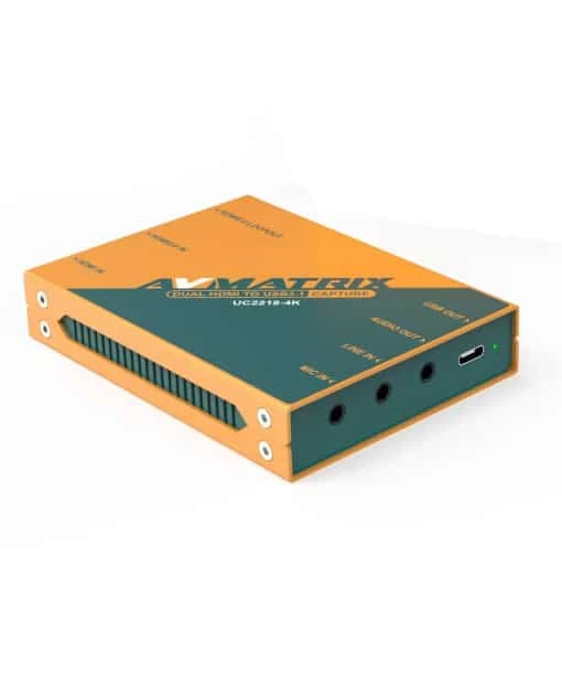 The AVmatrix UC2218-4K is a broadcast-grade real plug and play device to capture dual HDMI signal over USB3.1 Gen1 for graphics capture, live streaming, recording on your laptop, PC. It suppports 4K60Hz and 1080P60hz dual HDMI signal. It can capture two HDMI at same time through software like OBS in a split screen to achieve PiP, PoP, or software like Vmix to achieve switching between the two HDMI sources for live stream. It is compatible with Windows, Linux and macOS, support various applications such as OBS, Vmix, PotPlayer, ZOOM, Teams, Twitch, etc. UC2218-4K is your ideal choice for applications like game live, broadcast, v-log, remote education, conference, etc.