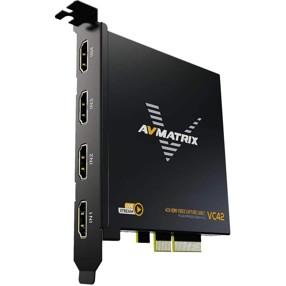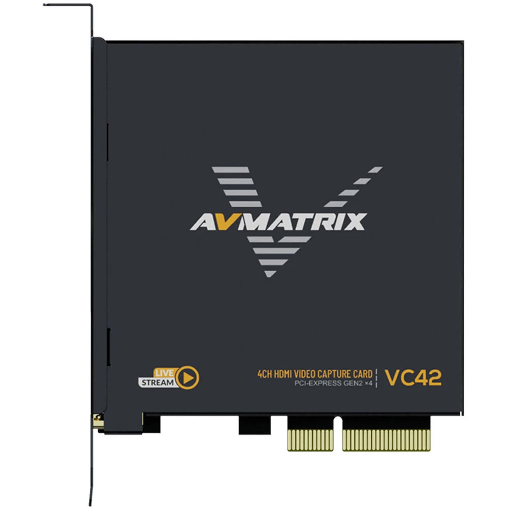 The AVMatrix VC42 is a 4-Channel HDMI PCIE video capture card, it supports four HDMI inputs and capture,and compatible with console or PC games and digital cameras. HD video capture up to 1080p60 with bit rates up to 200Mbps, transfer bandwidth up to 2.5GB/S, VC42 can meet the needs of high-bandwidth, high-performance image acquisition and processing applications,ideal for use in live streaming platforms.