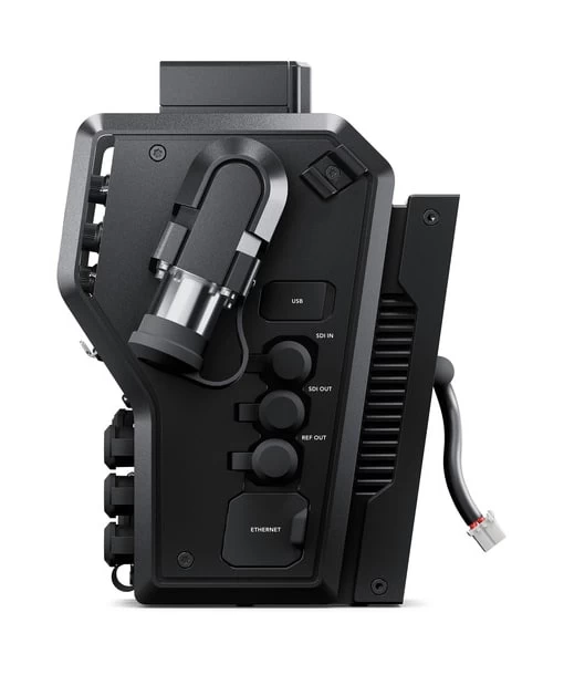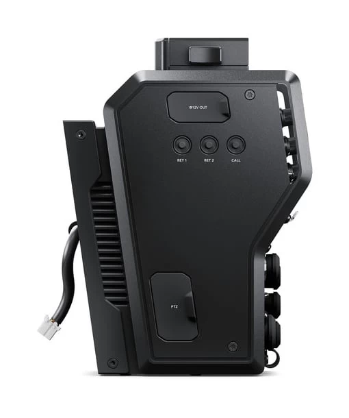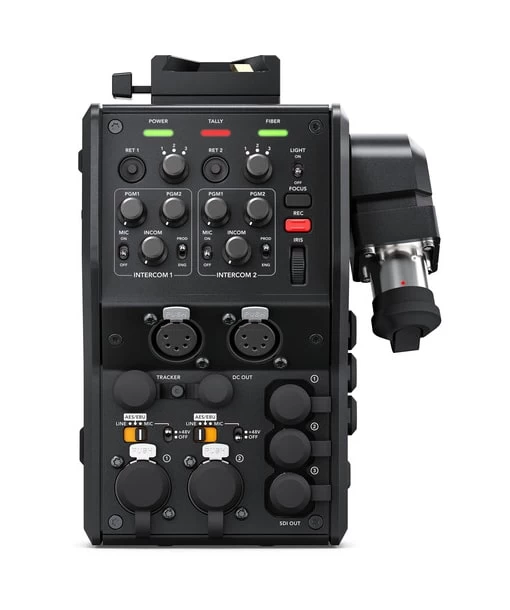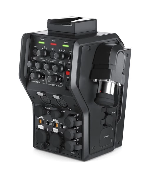 The Blackmagic Design Camera Fiber Converter connects your URSA Broadcast camera to interface with studio infrastructure via SMPTE fiber optic cable and a separately available Studio Fiber Converter for breakout up to 2.5KM away. The converter moves the most common camera controls to the rear of the camera assembly for ease of operator access. Studio-standard connectivity includes talkback headset 5-pin XLR ports, as well as SDI video for monitor output. In total, the Camera Fiber Converter has a single outgoing 12G-SDI connection for HD or UHD 4K video and three incoming 3G-SDI connections for monitoring with a separate studio viewfinder. Use the V-lock at the top to secure the studio viewfinder. All mounting hardware is included for securing the converter to the camera.