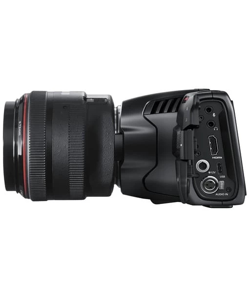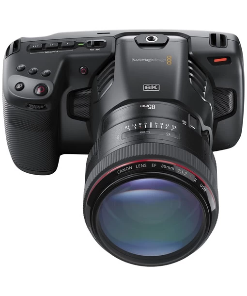 The Blackmagic Design Pocket Cinema Camera 6K is a full-featured, compact Super35 camera recording up to 50 fps 6144 x 3456 video, featuring an active Canon EF mount, letting users take advantage of the EF/EF-S–mount lenses.