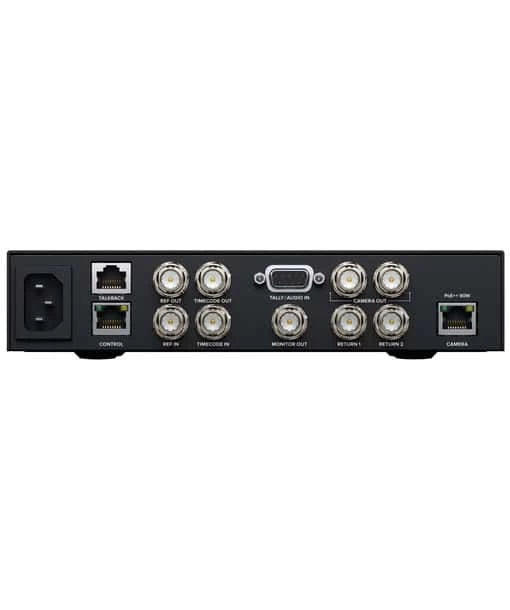 The Studio Converter has a built-in power supply that is well more than sufficient to power your camera, and it provides all the breakout connections from the camera, including converting camera and program return feeds to SDI. This enables patching your camera into your studio environment by just running a single Ethernet cable to your machine room. The Studio Converter can fit two in a rack, side by side, with an optional rack shelf minimizing the impact on your rack space.