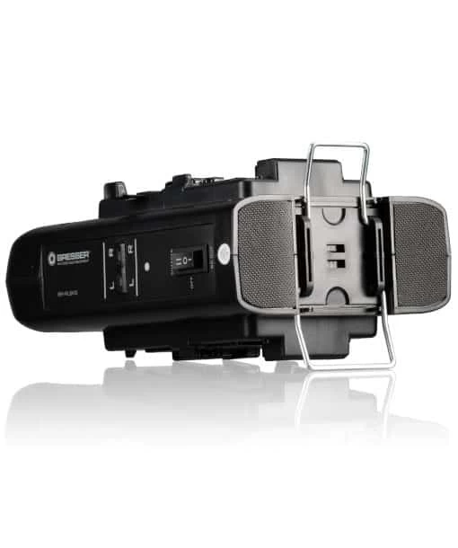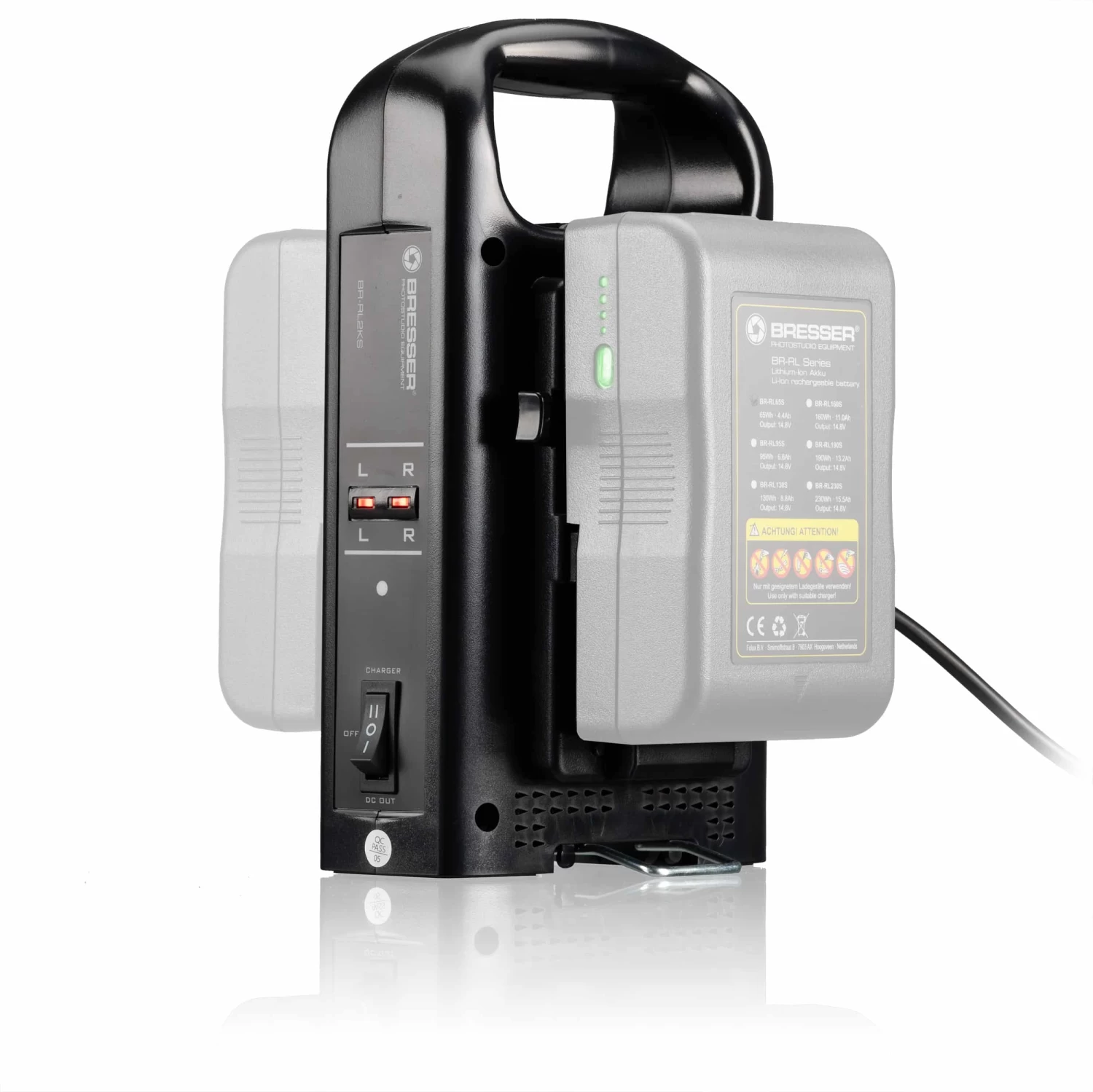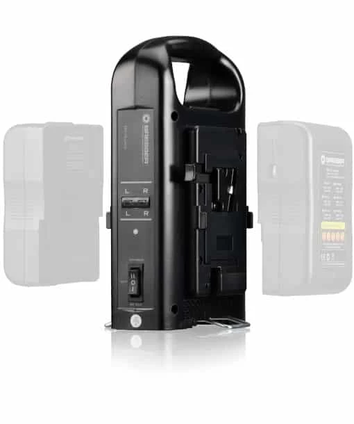 With this dual charger all battery packs with a V-Lock mount can be charged (including those from Bresser, Soca Land). The batteries can be attached at the side with a click function and under the letters L and R the charge status of the respective battery is displayed. Underneath is a fold-out stand so that the charger remains upright. The charger can also be used as a mains plug.