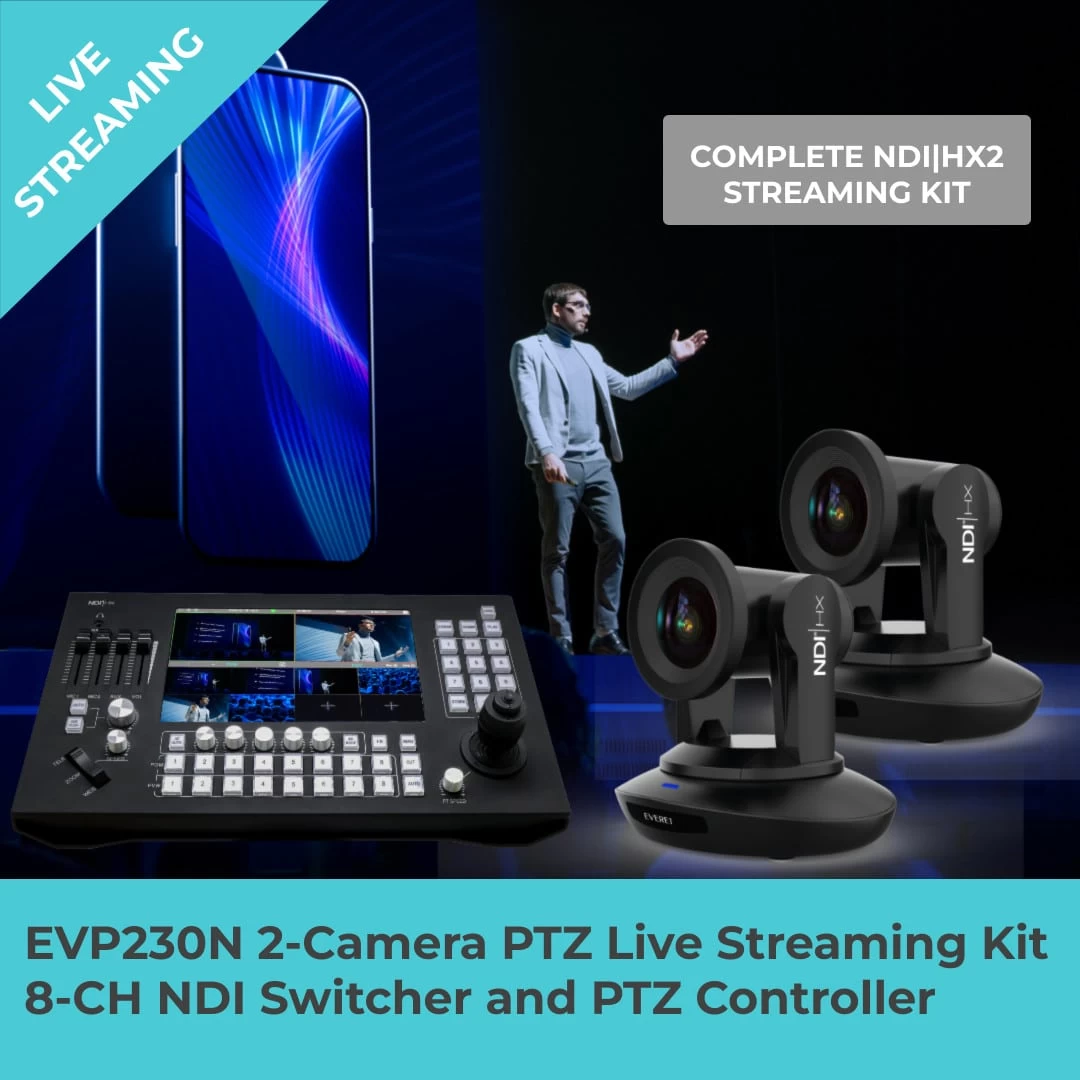 EVP230N 2-Camera PTZ Live Streaming Kit 8-Channel NDI Switcher and PTZ Controller