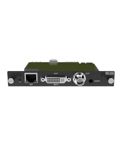 The Kiloview Cradle Serie RD-230 is an IP & SRT decoder that can output SDI, DVI-I/ HDMI signals simultaneously including audio through 3.5mm. Each decoding module includes a network port, SDI, HDMI/DVI-I interface and 3.5mm audio output. The modules are independent of each other. The input supports up to 1080P60 IP & SRT streams, which is backward compatible and adjustable. Sound can be output with HDMI / SDI, or independently from 3.5mm audio port.