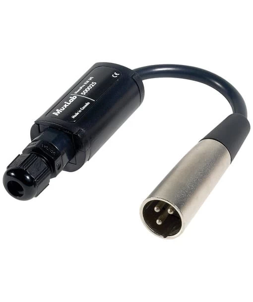 The MuxLab 500025 MonoPro XLR (Male) transmits standard AES analog up to 1.5km via Cat 5 and digital audio up to 426m via Cat5e/6. It features a heavy-duty cable strain relief for harsh environments and locking XLR3-M connectors for providing versatile cabling solution. As the wires terminate inside the balun, the MonoPro XLR can be used as a solderless connection point for standard shielded audio cable.