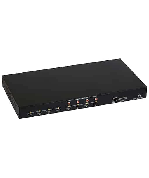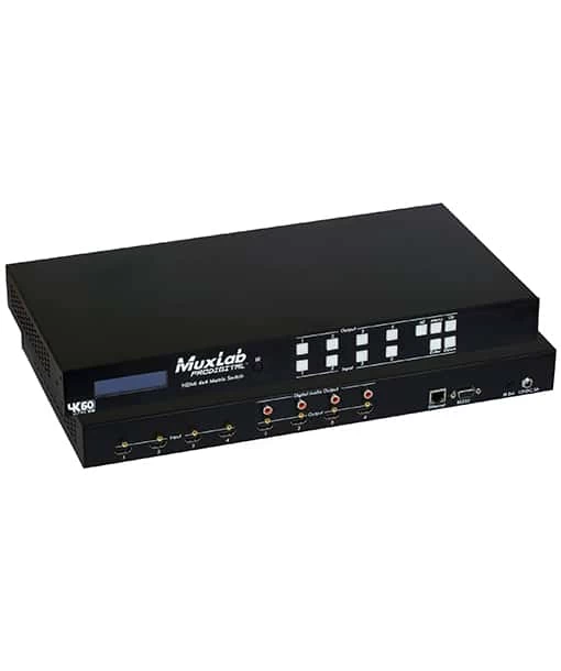 The MuxLab 500444 4×4 4K60 HDMI Matrix Switch connects four HDMI sources to four HDMI displays. This 4×4 matrix provides four HDMI inputs and outputs that support up to UHD 4K60 with 4:4:4 color sampling, 3D formats, and independent EDID control. It supports signals from Blu-ray players, media players, cameras, set-top boxes, home theater systems, and game consoles that connect to an HDMI display. The four S/PDIF coax outputs allow you to de-embed the audio from each the HDMI input to play on external speakers.