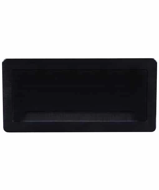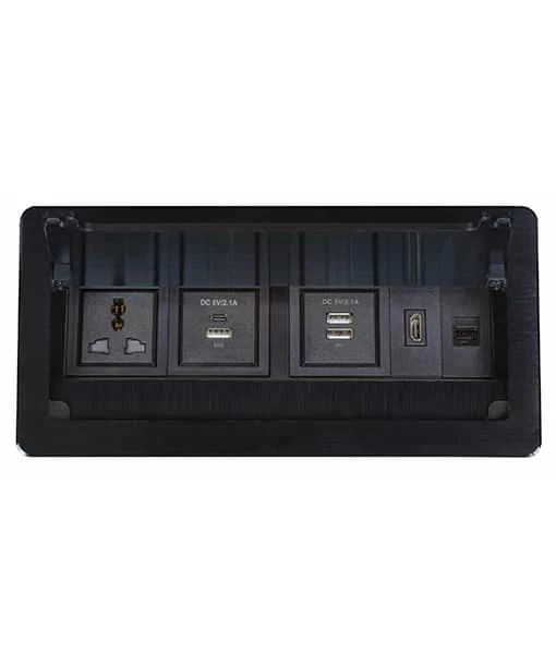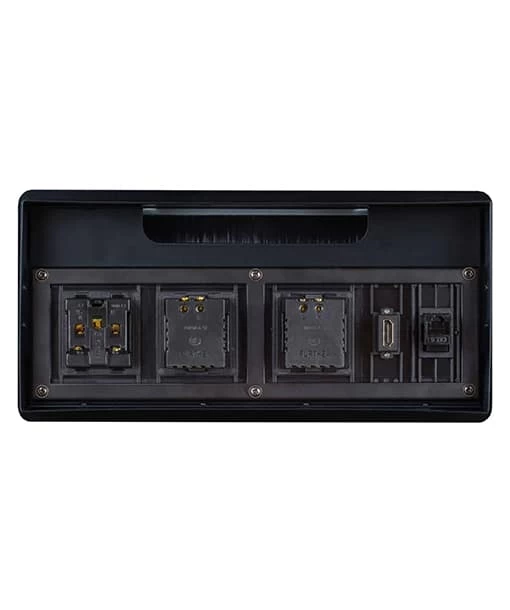 The black MuxLab 500610 Table Top Panel is designed as a head-end cable management solution, allowing any combination of Modules can take up one module spaces to be installed (modules sold separately). Head-end A/V equipment such as laptops, multimedia players, USB devices , and power distribution may be installed on the conference room table and connected to the structured cabling system via a vast array of cables. The Table Top Panel may be installed on a wide variety of tables using a versatile attachment system. The following modules can take up one module space (P/N 500612, 500614, 500615, 500618, 500619) or two spaces (P/N: 500613, 500616, 500617).
