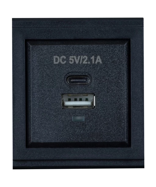 The MuxLab 500617 black Dual USB-A & USB-C Charger Module can be inserted into the MuxLab Table Top Panel, which can support up to four dual modules. This module has one USB-A and one USB-C port, each delivering 5 VDC.