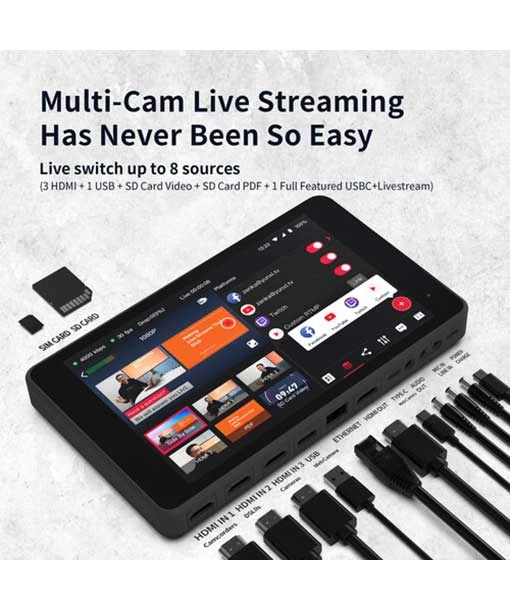 The device works as a switcher, with a variety of picture-in-picture templates as well as graphic layers. It has a built-in encoder that allows for live streaming, and it can record to optional SD cards up to 128GB.